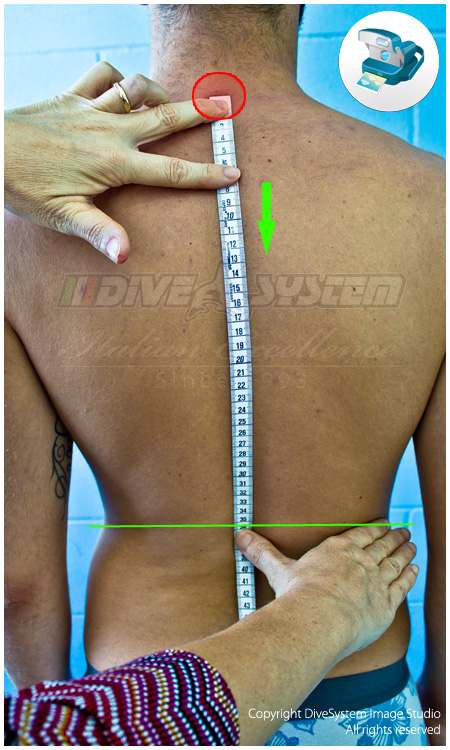 Place the tape measure from the vertebra at the end of the neck to the waist. The tape measure have to touch the skin (has shown in picture).
