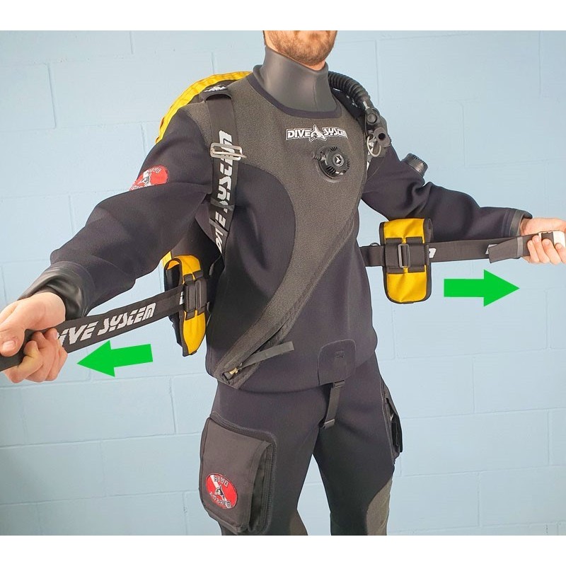 > No buckles and no seams but fully adjustable webbing. A single webbing harness with Super quick fit and comfy equipment removal.