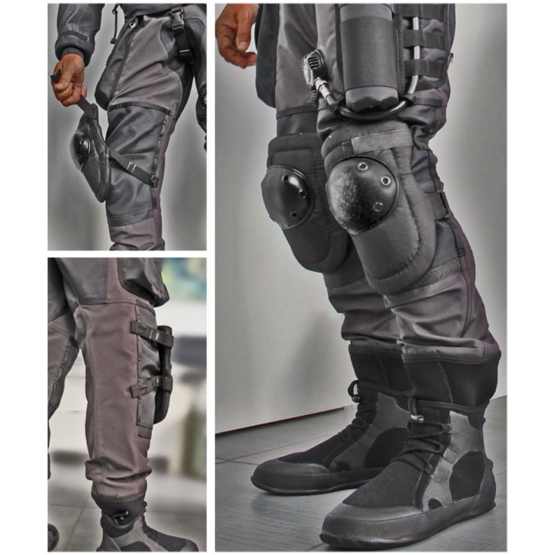Heavy Duty Knee Protection (optional): The Dry Suit can be factory-prepared for the use of the Heavy Duty Knee Protection. The Heavy Duty Knee Protection is designed to leave the back of the knee free from straps, ensuring Comfort and Mobility.